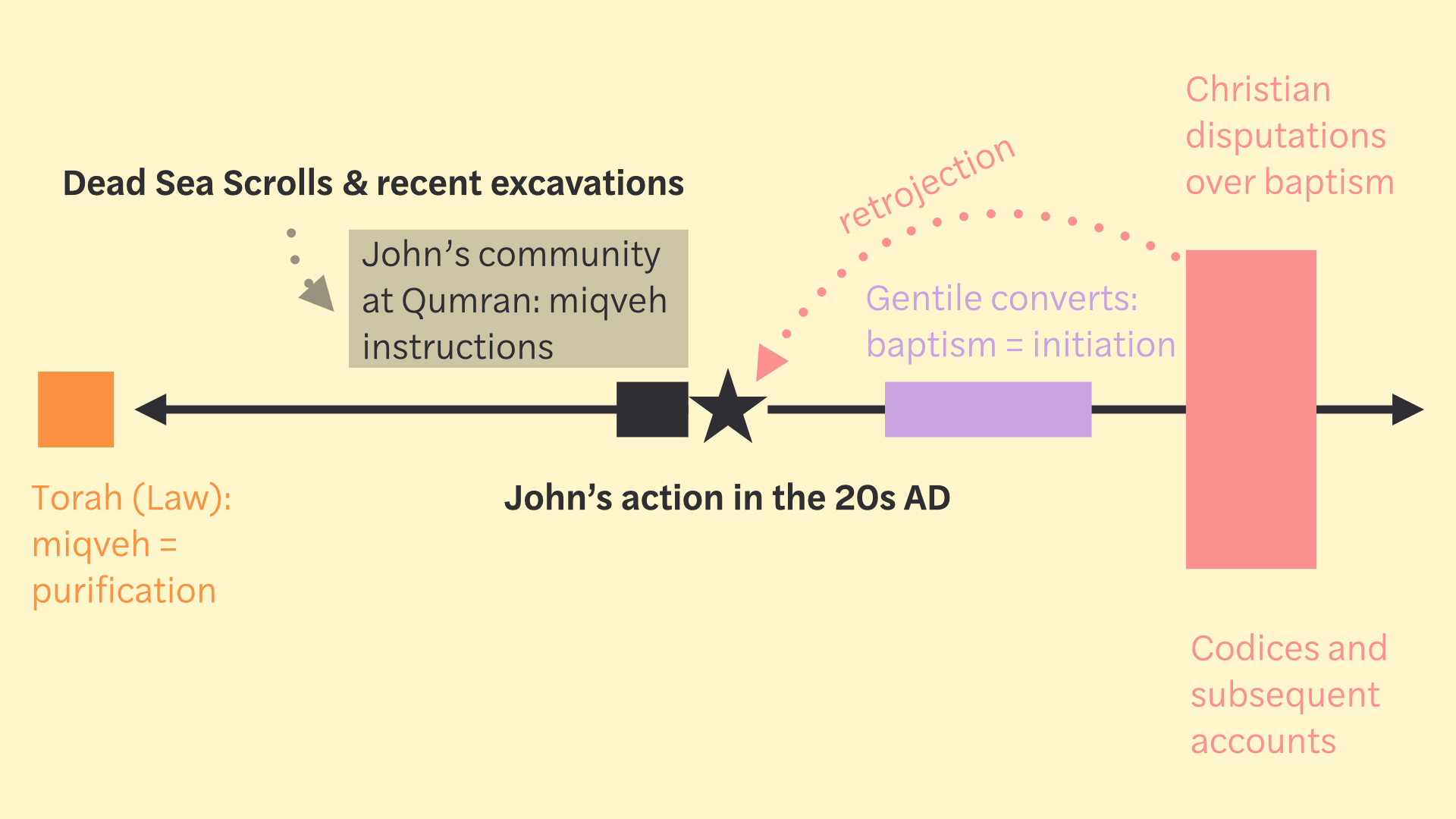 If we rely only on the accounts in the Four Gospels, we’ll have a Greek philosophical concept of baptism for initiation that developed in the decades and centuries after Jesus. And this concept was manifestly retrojected backward onto John to the point of renaming him: he becomes “the Baptist,” when John would not have recognized himself as neither Greek nor a Gentile nor a baptizer. We have more accurate text and context from the Old Testament and the Qumran “Miqveh scroll,” as well as confirming artifacts from archaeological excavations of miqva’ot (constructed miqveh basins) that date to the time and vicinity of John and Jesus. John was foremost a priest—a key figure in the very long practice of miqveh that has lasted to the present.